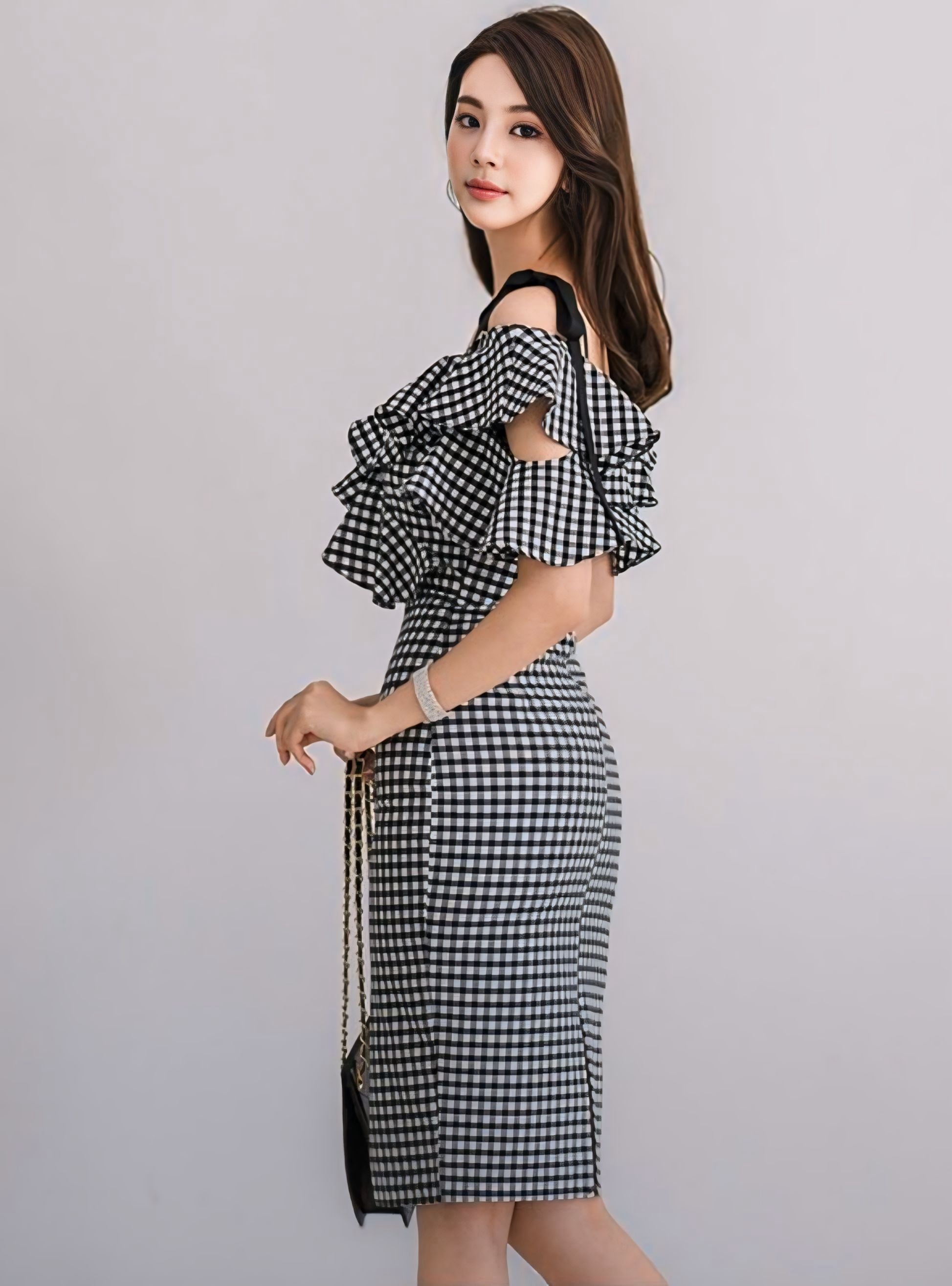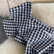 女性らしいラインが引き立つ美しさ、フリルとギンガムチェックの可愛らしさ。ダブルの良さがギュッと詰まったワンピース。